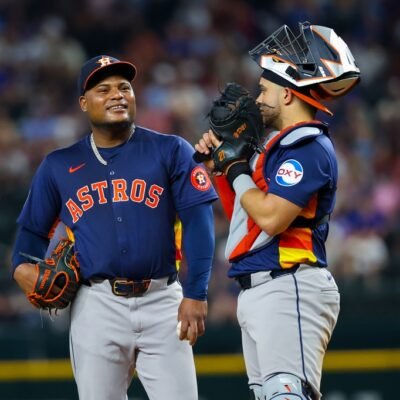Aug 6, 2024; Arlington, Texas, USA; Houston Astros starting pitcher Framber Valdez (59) laughs with Houston Astros catcher Yainer Diaz (21) during the eighth inning