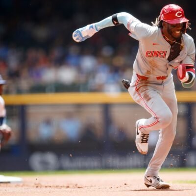 Cincinnati Reds Shortstop Elly De La Cruz (44) runs to third base during a game between the Milwaukee Brewers and Cincinnati Reds at American Family
