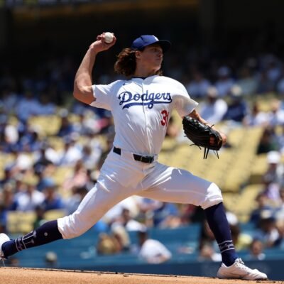 Aug 11, 2024; Los Angeles, California, USA; Los Angeles Dodgers starting pitcher Tyler Glasnow (31) throws during the first inning against the Pittsburgh Pirates at