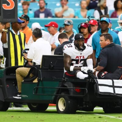 Aug 9, 2024; Miami Gardens, Florida, USA; Atlanta Falcons safety DeMarcco Hellams (23) is carted off the field against the Miami Dolphins during the first