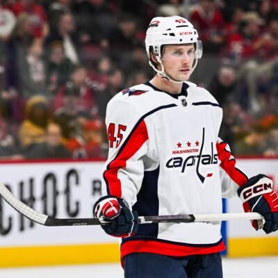 Oct 21, 2023; Montreal, Quebec, CAN; Washington Capitals right wing Matthew Phillips (45) against the Montreal Canadiens during the third period at Bell Centre. Mandatory