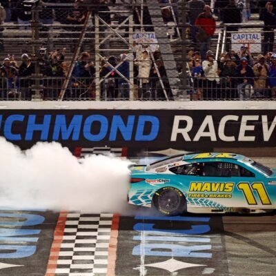Mar 31, 2024; Richmond, Virginia, USA; NASCAR Cup Series driver Denny Hamlin (11) celebrates after winning the Toyota Owners 400 at Richmond Raceway. Mandatory Credit: