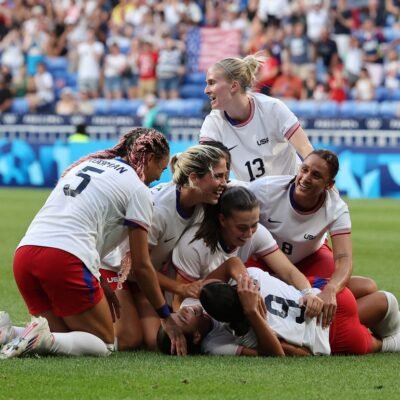 [US, Mexico & Canada customers only] Aug 6, 2024; Decines-Charpieu, France; Sophia Smith of the United States celebrates with teammates after scoring a goal against