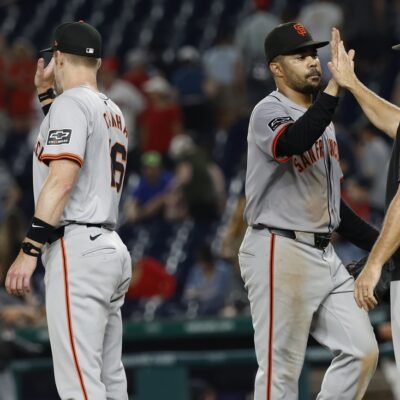 Aug 7, 2024; Washington, District of Columbia, USA; San Francisco Giants players celebrate after their game against the Washington Nationals at Nationals Park. Mandatory Credit: