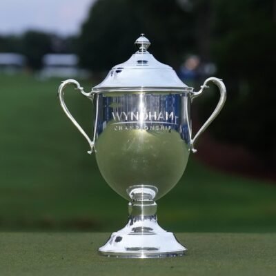 Aug 6, 2023; Greensboro, North Carolina, USA; A general view of the champions trophy on the 18th green during the final round of the Wyndham