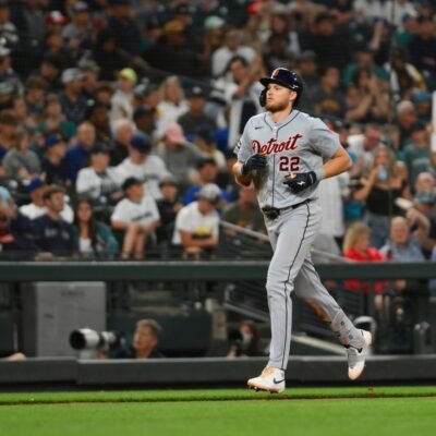 Aug 6, 2024; Seattle, Washington, USA; Detroit Tigers center fielder Parker Meadows (22) runs the bases after hitting a home run against the Seattle Mariners