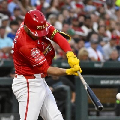 Aug 7, 2024; St. Louis, Missouri, USA; St. Louis Cardinals third baseman Nolan Arenado (28) hits a two run single against the Tampa Bay Rays