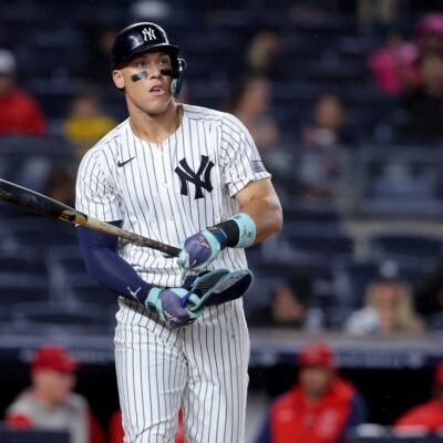 Aug 7, 2024; Bronx, New York, USA; New York Yankees center fielder Aaron Judge (99) reacts after drawing a walk against the Los Angeles Angels