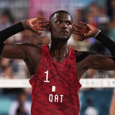 Cherif Younousse of Qatar reacts after winning the match against Team USA in the men’s quarterfinal of beach volleyball at the Paris Olympics. There will