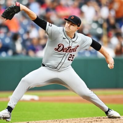 Jul 22, 2024; Cleveland, Ohio, USA; Detroit Tigers starting pitcher Tarik Skubal (29) throws a pitch during the first inning against the Cleveland Guardians at