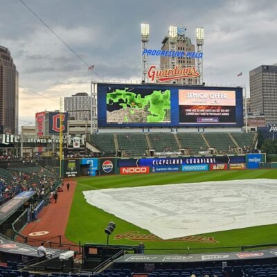 Aug 6, 2024; Cleveland, Ohio, USA; A general view of the field during a weather delay before a game between the Cleveland Guardians and the