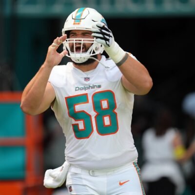 Miami Dolphins guard Connor Williams (58) takes the field before the opening game of the season against the New England Patriots at Hard Rock Stadium