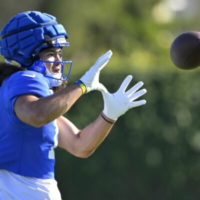 Jul 29, 2024; Los Angeles, CA, USA; Los Angeles Rams wide receiver Puka Nacua (17) catches a pass during training camp at Loyola Marymount University.