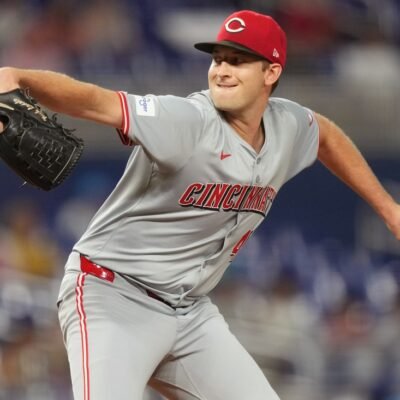 Aug 6, 2024; Miami, Florida, USA; Cincinnati Reds starting pitcher Nick Lodolo (40) pitches against the Miami Marlins in the first inning at loanDepot Park.
