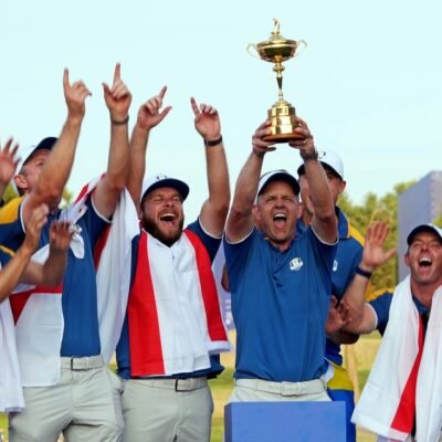 Oct 1, 2023; Rome, ITA; Team Europe captain Luke Donald and Team Europe celebrates with the Ryder Cup after beating Team USA during the final
