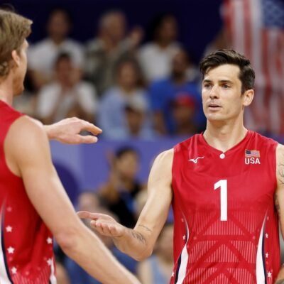 Aug 2, 2024; Paris, France; United States middle blocker Maxwell Holt (12) high fives opposite Matthew Anderson (1) after a play against Japan during a