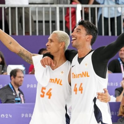 Aug 5, 2024; Paris, France; Netherlands player Worthy de Jong (54) and Arvin Slagter (44) celebrate after defeating Lithuania in the men’s 3×3 basketball semifinal