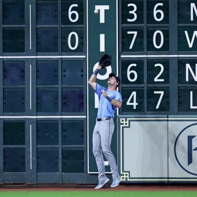 Aug 4, 2024; Houston, Texas, USA; Tampa Bay Rays left fielder Kameron Misner (26) catches a fly ball for an out against the Houston Astros
