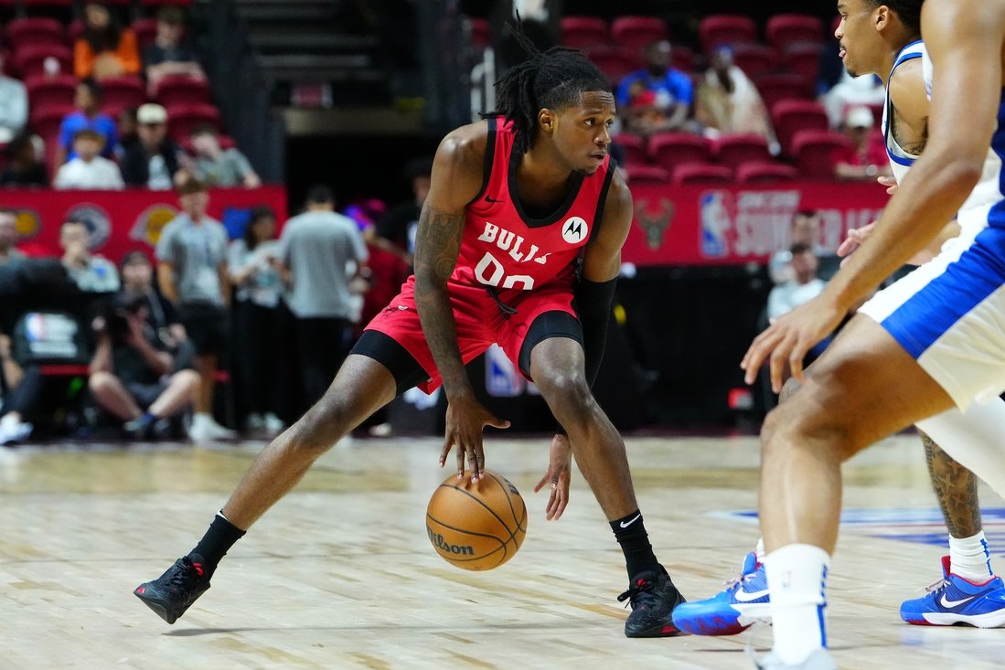 NBA: Summer League-Chicago Bulls at Golden State WarriorsJul 14, 2024; Las Vegas, NV, USA; Chicago Bulls guard DJ Steward (00) dribbles against the Golden State Warriors during the second quarter at Thomas & Mack Center. Mandatory Credit: Stephen R. Sylvanie-USA TODAY Sports