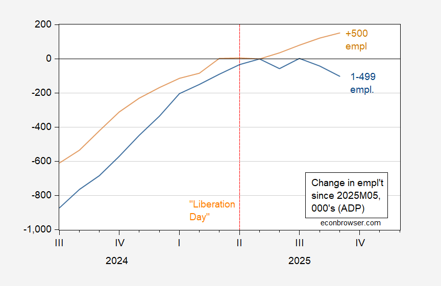 Figure 1: Change in employment from May 2025 in firms with less than 500 employees (blue), in firms with 500 and more employees (tan), both in 000’s, s.a. Source: ADP via FRED, and author’s calculations.