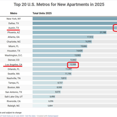 John Arnold points us to this table on new apartments and pointedly notes that the population of LA (18.5 m) is more than 7 times