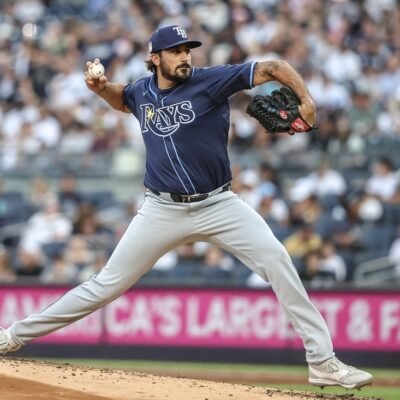 Jul 19, 2024; Bronx, New York, USA; Tampa Bay Rays starting pitcher Zach Eflin (24) pitches in the first inning against the New York Yankees