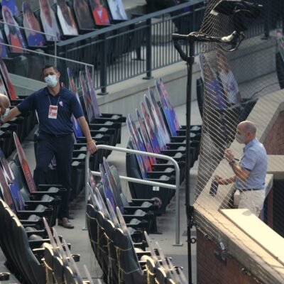 Jul 18, 2020; New York City, New York, USA; New York Mets general manager Brodie Van Wagenen (second from left) and special assistant Omar Minaya