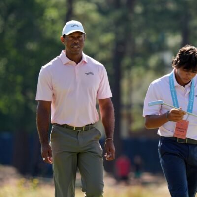 Jun 11, 2024; Pinehurst, North Carolina, USA; Tiger Woods and his son Charlie Woods walk off the seventh green during a practice round for the