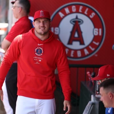 Jun 26, 2024; Anaheim, California, USA; Los Angeles Angels center fielder Mike Trout (27) walks in the dugout during the MLB game against the Oakland