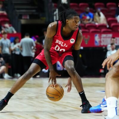Jul 14, 2024; Las Vegas, NV, USA; Chicago Bulls guard DJ Steward (00) dribbles against the Golden State Warriors during the second quarter at Thomas