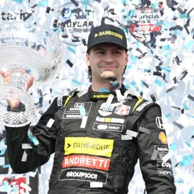 Jul 21, 2024; Toronto, Ontario, CAN; Andretti Global driver Colton Herta (26) holds the crystal trophy after winning the Honda Dealers Indy at Streets of