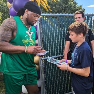 Baltimore Ravens running back Derrick Henry signs a magazine for a young fan at the Two-All Carnivall in Yulee on June 29, 2024. [Clayton Freeman/Florida