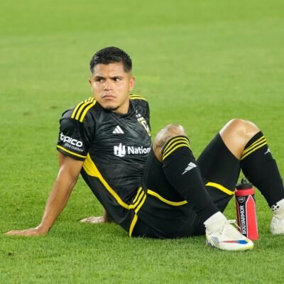 Jul 17, 2024; Columbus, OH, USA; Columbus Crew forward Cucho Hernandez (9) sits on the pitch following the MLS soccer game against Charlotte FC at