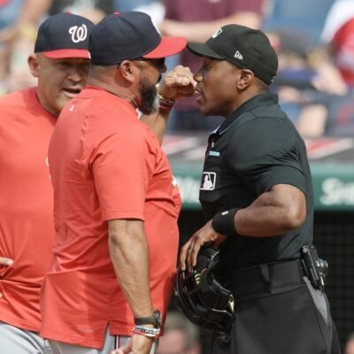 Jun 1, 2024; Cleveland, Ohio, USA; Washington Nationals manager Dave Martinez, middle, argues with umpire Malachi Moore after center fielder Jacob Young (not pictured) was