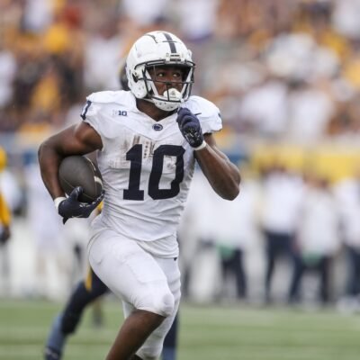 Aug 31, 2024; Morgantown, West Virginia, USA; Penn State Nittany Lions running back Nicholas Singleton (10) runs the ball for a touchdown during the third