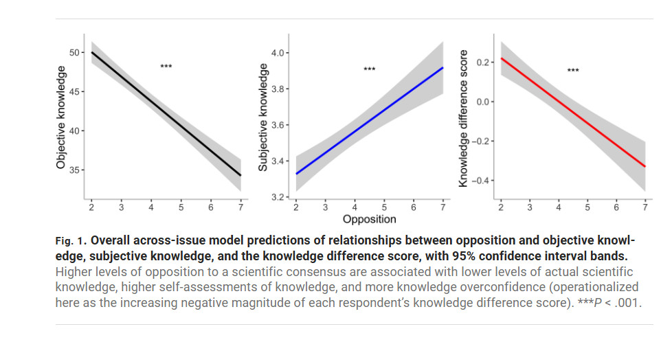 The authors then correlate respondents’ scores on the objective (uncontroversial) knowledge with their opposition to the scientific consensus on topics like vaccination, nuclear power, and homeopathy. The result is striking: people who are most opposed to the consensus (7, the far right of the horizontal axis in the figure below) score lower on objective knowledge but express higher subjective confidence. In other words, anti-consensus respondents are the most confidently wrong—the gap between what they know and what they think they know is widest.