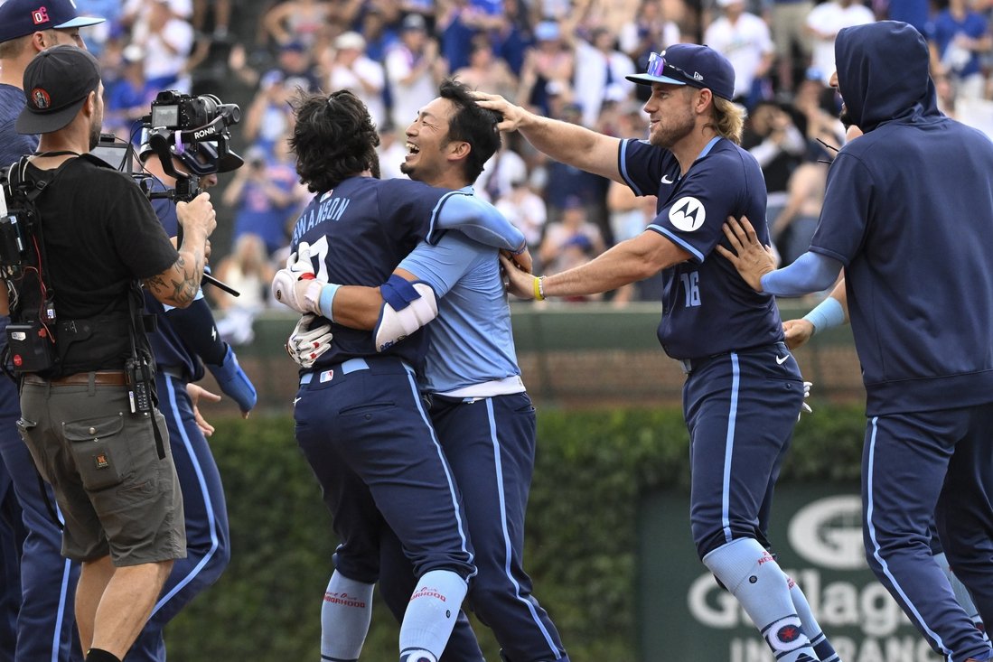 Aug 16, 2024; Chicago, Illinois, USA; Chicago Cubs outfielder Seiya Suzuki (27) celebrates with shortstop Dansby Swanson (7) after hitting the game winning RBI single against the Toronto Blue Jays during the tenth inning at Wrigley Field. Mandatory Credit: Matt Marton-USA TODAY Sports Seiya Suzuki’s single in the 10th inning scored automatic runner Ian Happ after Toronto tied the game with three runs in the ninth as the Chicago Cubs beat the visiting Blue Jays 6-5 on Friday afternoon.
