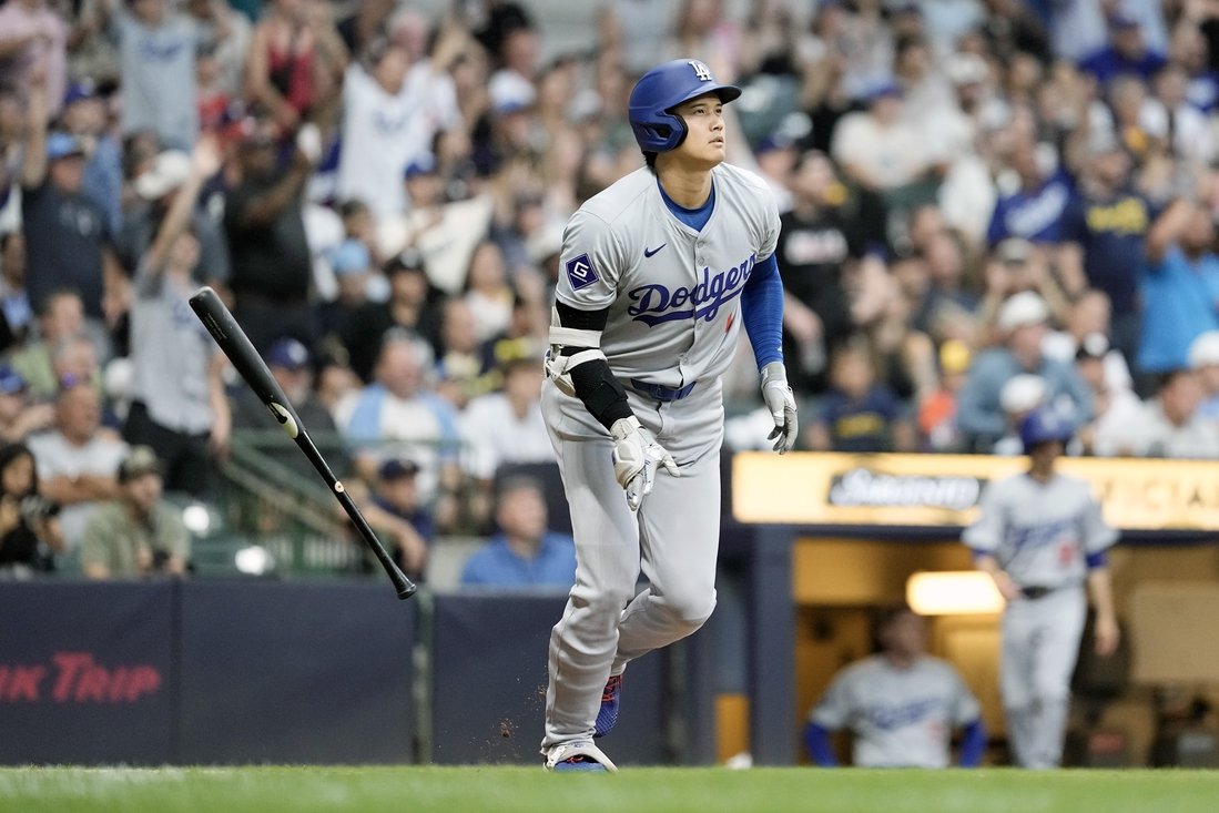 Aug 13, 2024; Milwaukee, Wisconsin, USA; Los Angeles Dodgers designated hitter Shohei Ohtani (17) flips his bat away after hitting a home run during the third inning against the Milwaukee Brewers at American Family Field. Mandatory Credit: Jeff Hanisch-USA TODAY Sports Gavin Lux and Andy Pages each hit two-run homers during a five-run fourth inning and Gavin Stone tossed five solid innings as the visiting Los Angeles Dodgers beat the Milwaukee Brewers 7-2 on Tuesday for their fifth straight victory.