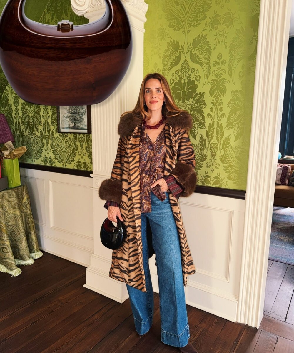 Kallmeyer Top, Farm Rio Pants, JB x Jennifer Behr Necklace, Chanel Flats (similar here), Hermes Bag (on the RealReal here, similar here) | Farm Rio Dress, Vest (similar here & here), Aquazzura Boots (similar here), Bottega Veneta Bag (similar here)