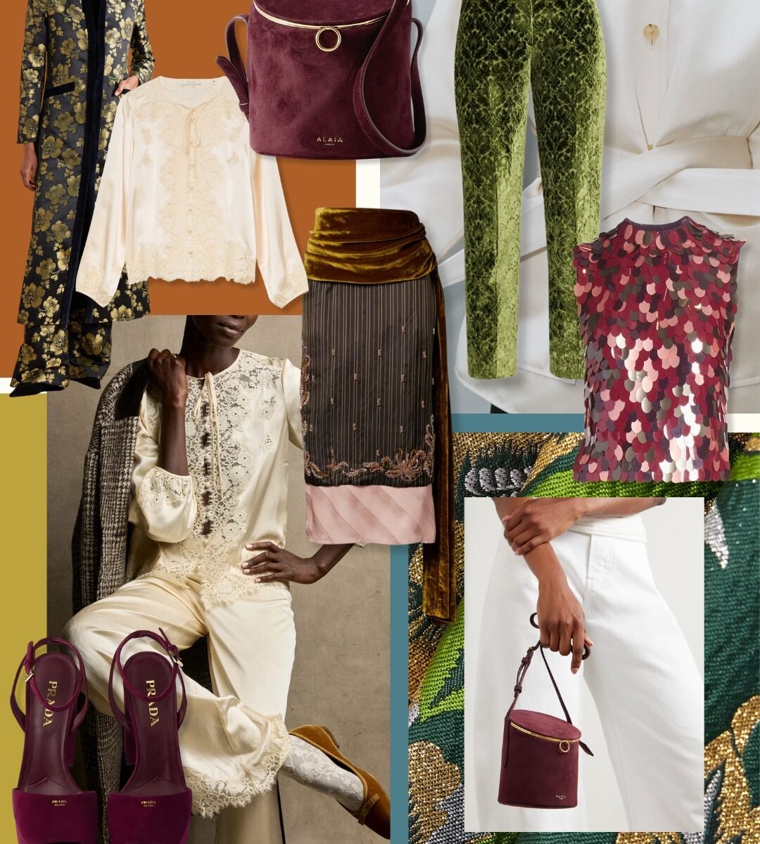 This season’s moodboard brims with energy: silks and satins that flow with movement, sequins that catch the light, and velvets with a deep, dramatic richness. Moody florals and lace bring a romantic touch, while suede and leather ground the palette with texture and balance. Embellished coats add a statement-making layer, while sculptural bags and simple flats bring striking dimension. Each element stands out on its own yet comes together in my early season planning, shaping a wardrobe that embraces autumn’s darker tones and the spirit of what lies ahead.