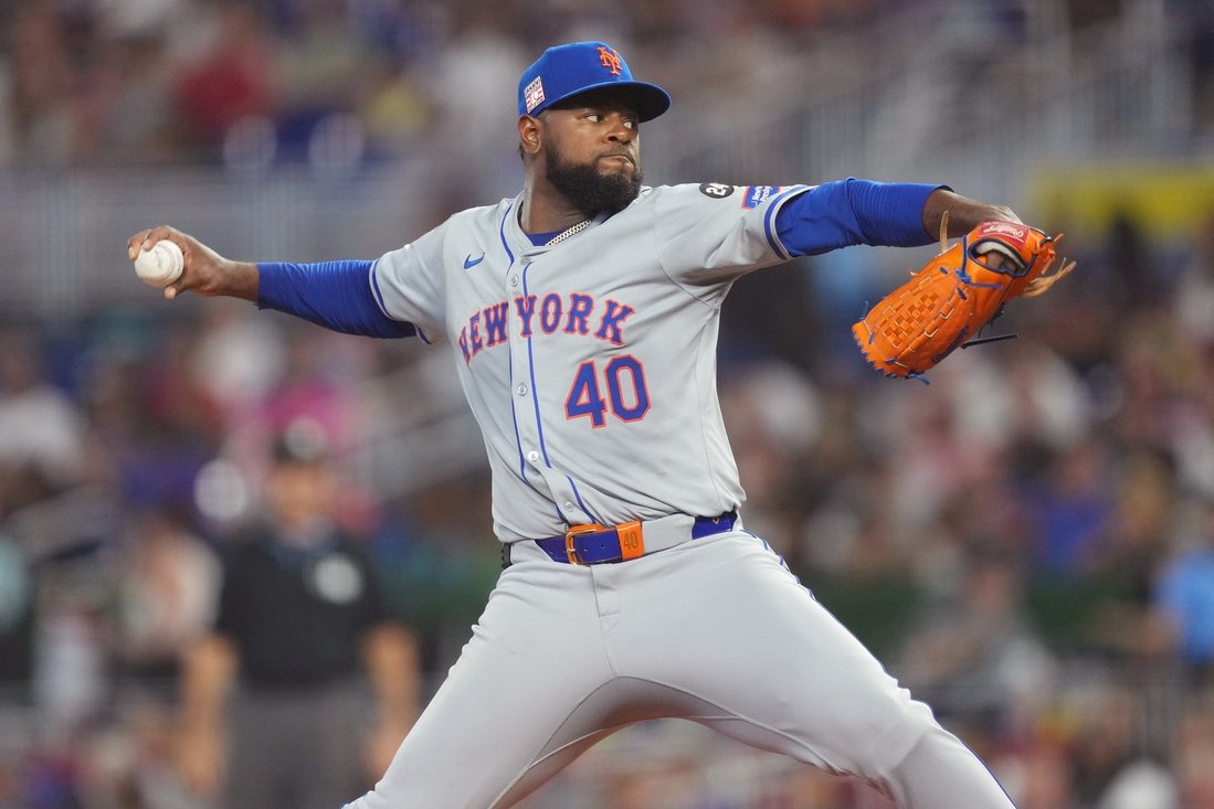 Jul 20, 2024; Miami, Florida, USA; New York Mets starting pitcher Luis Severino (40) throws against the Miami Marlins in the first inning at loanDepot Park. Mandatory Credit: Jim Rassol-USA TODAY Sports Luis Severino and three relievers combined on a four-hit shutout Saturday as the visiting New York Mets edged the Miami Marlins 1-0.