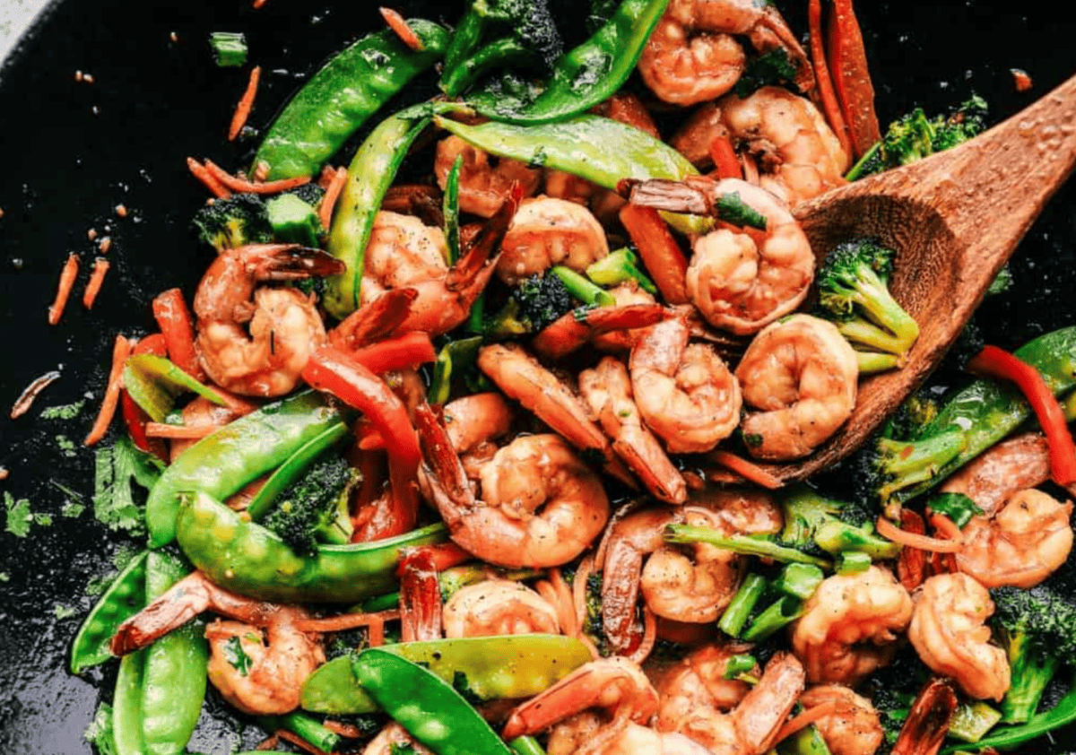 Use high heat and a large wok/pan. High heat keeps veggies tender and crisp, and the shrimp juicy. A wok lets the veggies spread out and sear instead of steaming.
