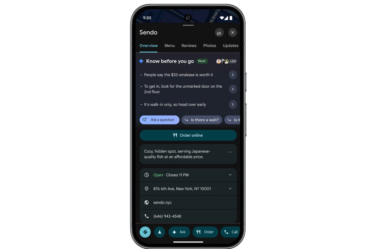 Now, when you search for places in Maps like restaurants, hotels or concert venues, scroll down to find new “know before you go” tips — it’s like having a knowledgeable guide show you the way. Using Gemini capabilities, Maps does the research for you: It uses reviews and helpful information it finds online to surface top insights, like the best way to book a reservation, what the secret menu items are, parking tips and more — and you can click on each of the tips to get more information.