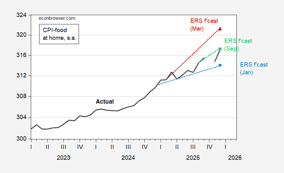 Figure 1: CPI-food at home (bold black), January 2025 forecats (light blue square), March forecast (red triangle), and September (inverted light green triangle), all s.a. Source: BLS via FRED, ERS, and author’s calculations.
