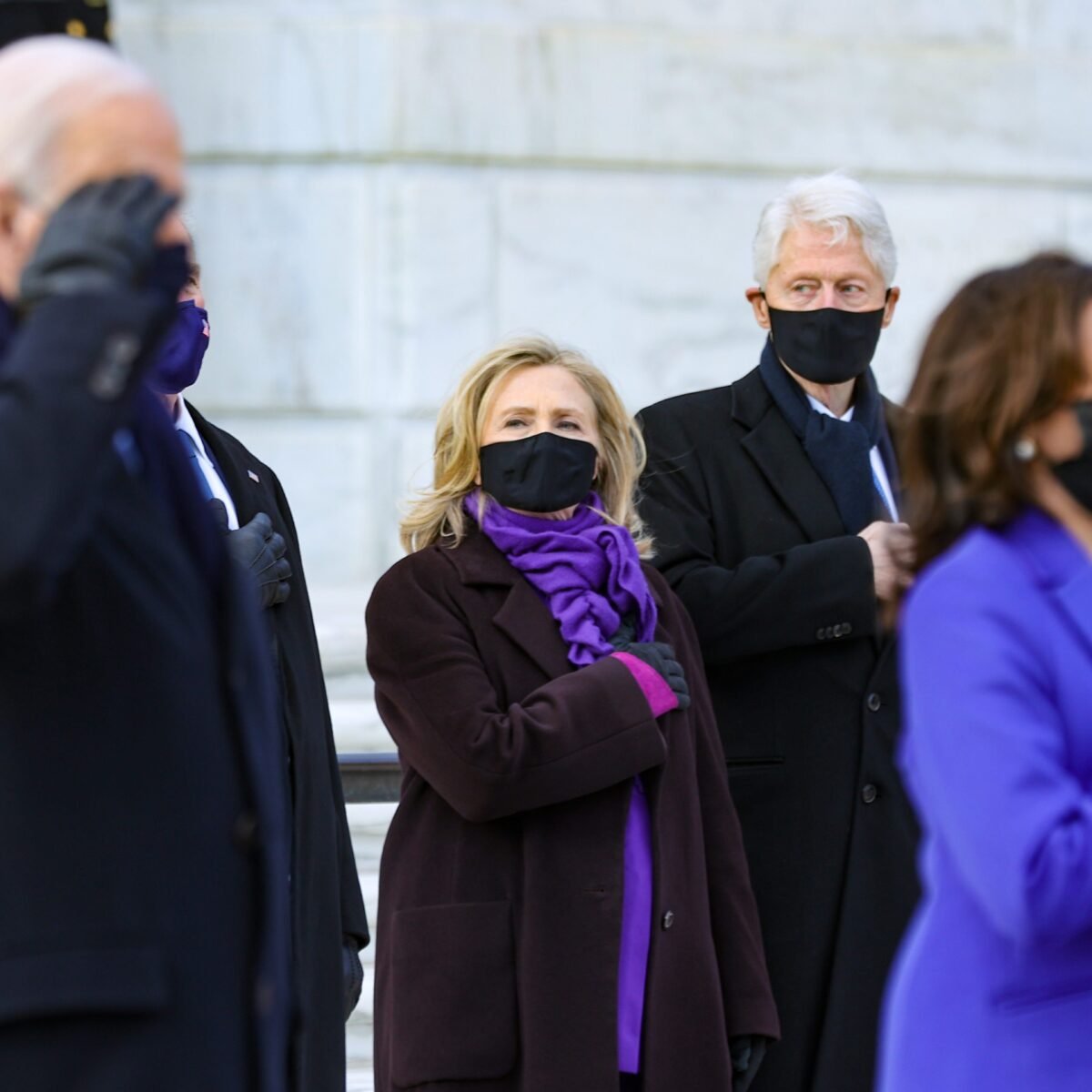 ARLINGTON, VA - JANUARY 20:   U.S. President Joe Biden and Vice President Kamala Harris attend a wreath-laying ceremony at Arlington National Cemetery's Tomb of the Unknown Soldier after the 59th Presidential Inauguration ceremony at the U.S. Capitol, as former U.S. President George W. Bush and Laura Bush, and former U.S. President Bill Clinton and former Secretary of State Hillary Clinton look on,  January 20, 2021  in Arlington, Virginia. During today's inauguration ceremony Joe Biden becomes the 46th president of the United States.   (Photo by Chip Somodevilla/Getty Images)