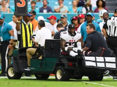 Falcons await news after S DeMarcco Hellams, LB Bralen Trice carted off field