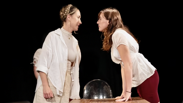Two women on stage standing up and looking at each other over a table.