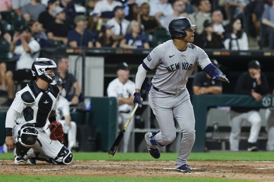 Aug 13, 2024; Chicago, Illinois, USA; New York Yankees outfielder Juan Soto (22) hits a solo home run against the Chicago White Sox during the fifth inning at Guaranteed Rate Field. Mandatory Credit: Kamil Krzaczynski-USA TODAY Sports Juan Soto launched three home runs and drove in four runs and Nestor Cortes pitched seven shutout innings to lift the visiting New York Yankees past the Chicago White Sox 4-1 on Tuesday.