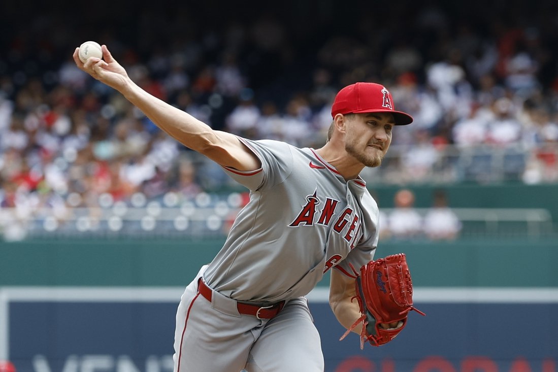 MLB: Los Angeles Angels at Washington NationalsAug 11, 2024; Washington, District of Columbia, USA; Los Angeles Angels starting pitcher Jack Kochanowicz (64) pitches against the Washington Nationals during the first inning at Nationals Park. Mandatory Credit: Geoff Burke-USA TODAY Sports