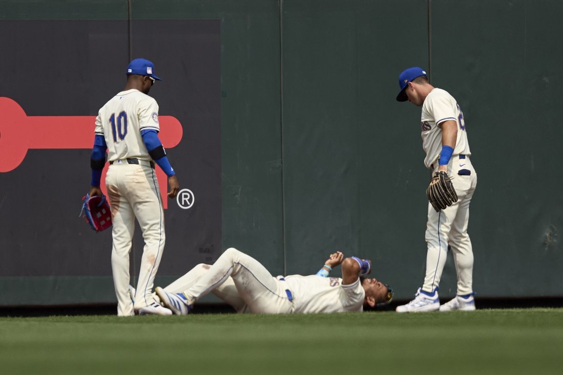MLB: Houston Astros at Seattle MarinersJul 21, 2024; Seattle, Washington, USA; Seattle Mariners outfielders Victor Robles and Dylan Moore check on center fielder Julio Rodríguez (44) after he was injured during the sixth inning at T-Mobile Park. Mandatory Credit: John Froschauer-USA TODAY Sports